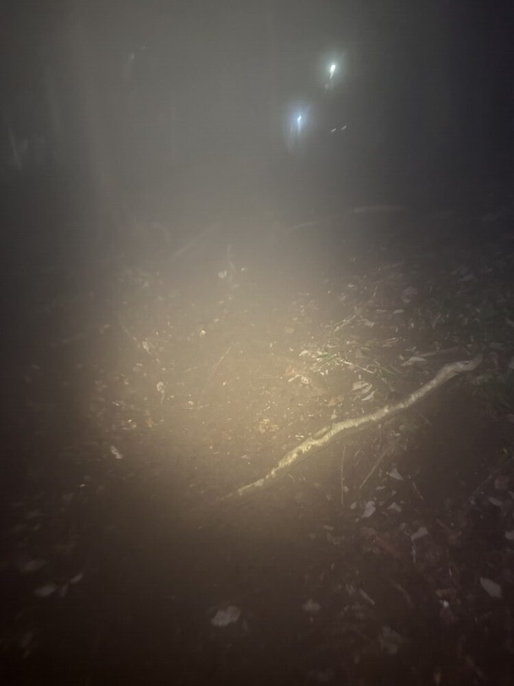 まだ巻き返せる範囲。ポールとヘッドライトを装着する。浅間峠から先は霧が一気に濃くなり、前が見えづらい。ヘッドライトの光が乱反射してしまうので光量は最小限に抑え、ウエストライトを頼りに進む。
