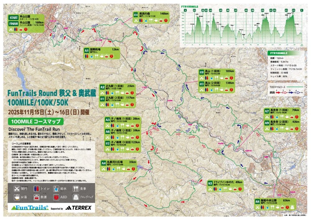 2024年に「FunTrails Round 秩父&奥武蔵 」が10周年を迎えたことを記念してFunTrails初の100マイルレースとしてFTR100mileが開催されました。獲得標高10,000m制限時間32時間というパンチの効いたコースで注目を集め、猛者達が挑んで完走率は38%。彩の国に並ぶ国内最難関の100mileレースが誕生しました。