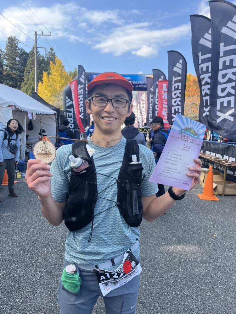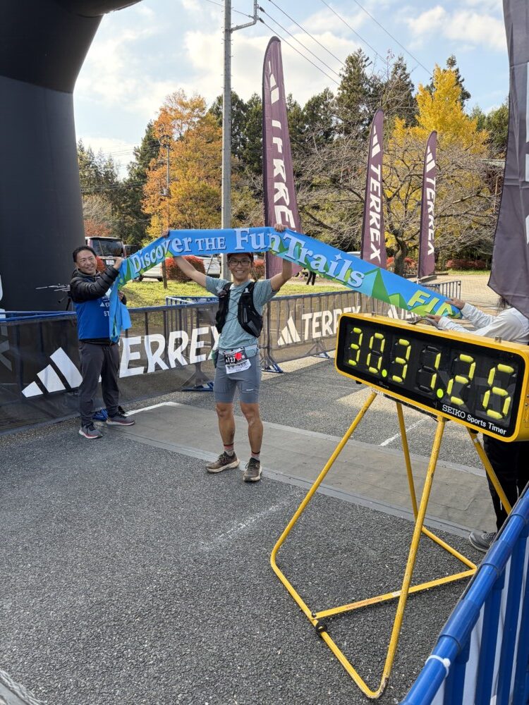 エイドを出て動き出すがラストの長い下りが走れなかった。元気だったら楽しそうなトレイルなのにもったいなかった。ようやく下りきってからは最初に通った8kmの長いロード。きつすぎてフラットなところも歩いてしまった。歩いて走っての繰り返しでギリギリのところで踏ん張って進んだ。抜かれるかと思ったが、なんとか抜かれずゴール近くまでたどり着いた。最後は再び走り出してフィニッシュ!