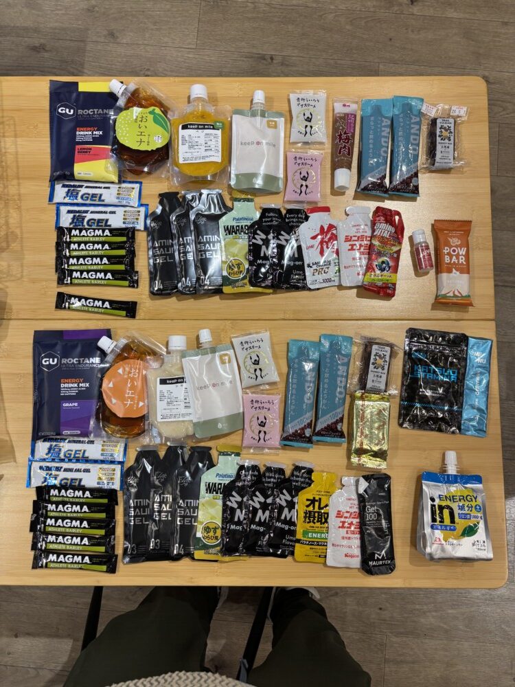 いつも通り、1時間毎にジェルを1本+ドリンク、固形物で200㎉を取る+エイドでもなるべく食べる計画。