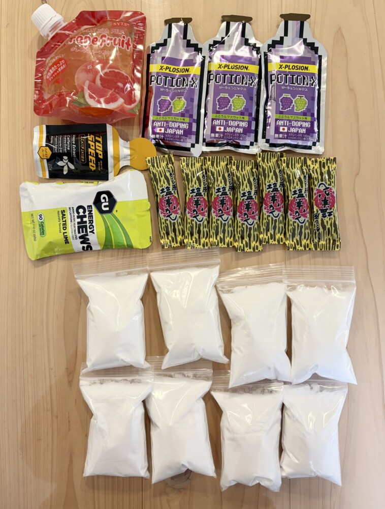 1周目は40分毎に塩羊かんを1個、1周終わりにTOP SPEED、2周目は80分毎にカフェイン入りのジェルを1個と気が向いたらGUのグミを食べる計画です。